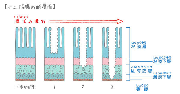 十二指腸の粘膜(ねんまく)がただれ、傷ついてしまう病気です。十二指腸の粘膜は薄(うす)いので、出血したり穴があいてしまうことも起こります。胃に近い部分に多く見られます。