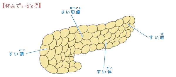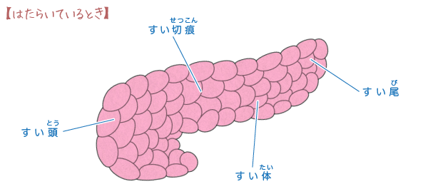 すい臓は、膵臓(すいぞう)と書きます。食べ物を消化するすい液を作り、十二指腸(じゅうにしちょう)に送り出すはたらきをしています。また、血液中の糖分の量を調節するホルモンを作り、血液の中に送り出すはたらきもしています。 すい臓は胃の後ろにあり、長さは20cmほどの細長い形をしています。