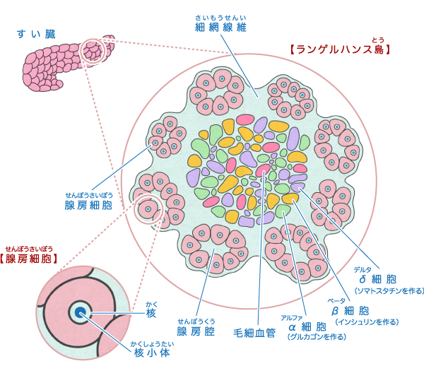 すい臓の中にはランゲルハンス島と呼ばれる細胞(さいぼう)の集まりがあります。その中のアルファ細胞ではグルカゴンを、ベータ細胞ではインスリンという血液中の糖分を調整するホルモンがそれぞれ作られています。
