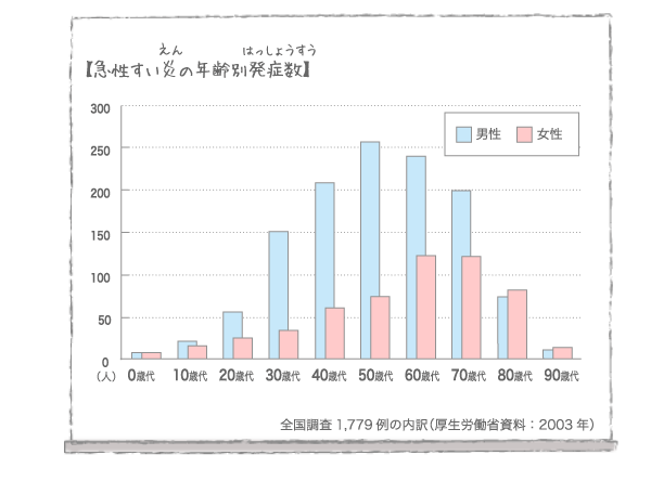 グラフからも分かるように、急性すい炎はおとなの男性に多い病気です。