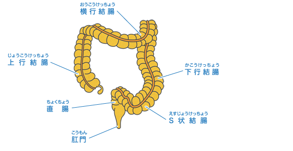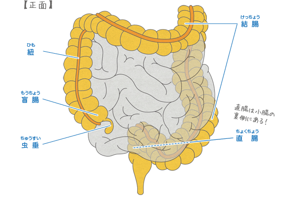 大腸は、水分やミネラルを吸収し、便を作るはたらきをしています。食事をしてから便が排泄(はいせつ)されるまでは通常24〜72時間かかります。大腸の長さは1.5メートルほどで、盲腸(もうちょう)、結腸(けっちょう)、直腸(ちょくちょう)に分けられます。