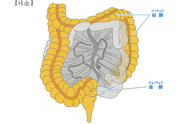 結腸は、便を作るはたらきをしています。水分を吸収し、便を作るほか、ナトリウムなどの電解質※(でんかいしつ)を吸収しています。さらに、小腸で消化しきれなかった食物繊維などを発酵させ、便を直腸へ送ります。