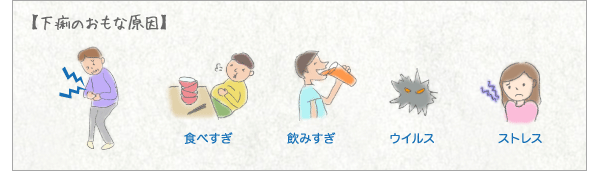 細菌(さいきん)やウイルスに感染していたり、食べすぎ・飲みすぎ、からだの冷え、大腸・小腸の病気、くすりの副作用などさまざまな原因があります。精神的なストレスや緊張(きんちょう)によって起こることもあります。