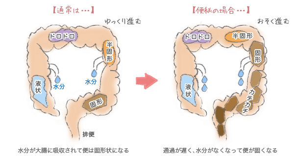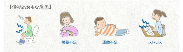 - 生活習慣や環境(かんきょう)、食事のとり方が変わったとき。食事の量や食物繊維(しょくもつせんい)がたりない、運動不足、便意(べんい)を我慢(がまん)してしまうとき。ストレスなどによって、腸のはたらきが低下してしまう場合。
