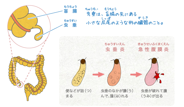俗(ぞく)にいう盲腸(もうちょう)です。虫垂が炎症(えんしょう)を起こした状態です。10〜20代に多い病気ですが、ほかの年代でも発症(はっしょう)します。