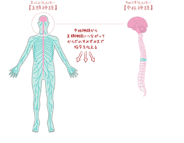 神経には、からだの各部分に網の目のように張りめぐらされた細かいネットワークの末梢神経(まっしょうしんけい)と、そこから集められた情報がさらに集まっている中枢神経(ちゅうすうしんけい)とがあります。