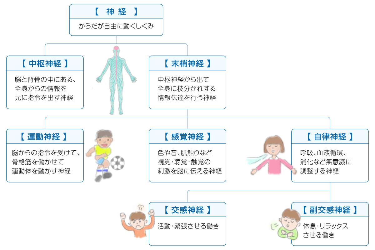 中枢神経と、からだの内外の諸器官に分布する神経とを結び、情報の伝達を行っています。末梢神経には、運動神経と感覚神経、自律神経(じりつしんけい)のみっつがあります。