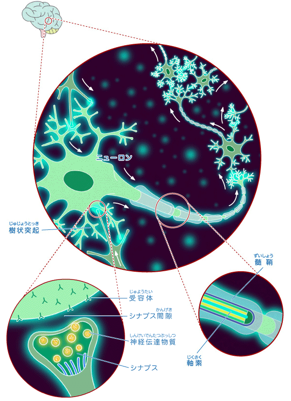 まず、脳の中にある、たくさんのニューロンという神経細胞が情報を伝えてくれます。