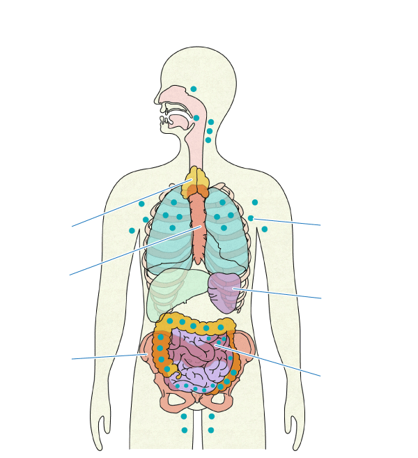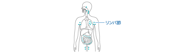 からだの各所に多数分布しているそら豆状の器官です。直径2〜20mmほどの大きさで人体内に400〜700個ほどが関所のように存在しているとされています。リンパ液中のいらない物を濾過(ろか)したり、免疫細胞たちが、皮膚(ひふ)などから入ってきた抗原(こうげん)〈細菌(さいきん)やウイルスなど〉とたたかって処理する場所でもあります。大きなリンパ節は、喉頸(のどくび)の下、両脇(わき)、腹部、脚(あし)の付け根、膝(ひざ)などにあり、あやしい微生物(びせいぶつ)を通さないように見張っています。