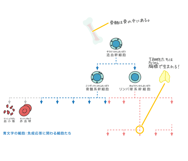 免疫細胞は骨髄(こつずい)のなかの造血幹細胞(かんさいぼう)から生まれて、次々に分かれて進化していきます。