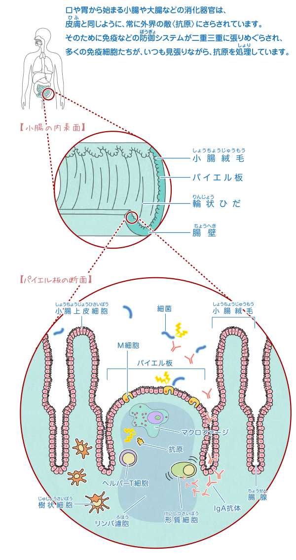 主に小腸の中にある粘膜免疫(ねんまくめんえき)システムです。