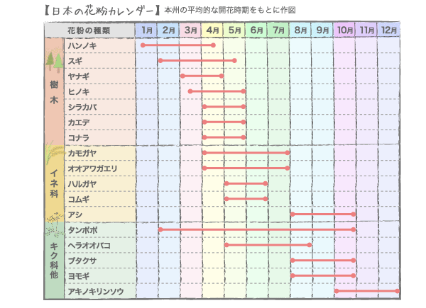 花粉はよく晴れた日中の風の強い日に飛びやすいので、そのような日には症状が重くなることが多いです。