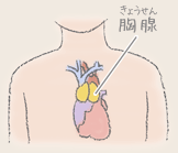 胸腺は左右二つからなり、心臓の上にかぶさるように位置しています。思春期頃に最も大きく30〜40g程度に達し、成人後は1/2程度に小さくなるといわれています。