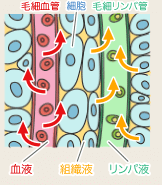 からだ中の末端(まったん)、手や足の毛細血管からも組織液が染み出て、リンパ液の流れに合流します。