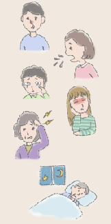 - その他の症状:咽喉頭(いんこうとう)の違和感、かゆみ、咳(せき)、頭痛、発熱、不眠、倦怠感(けんたいかん)などです。