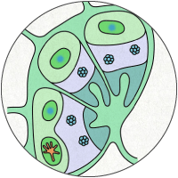 心臓から全身に送り出された血液の一部は、毛細血管の壁(かべ)にあいた目に見えない小さなすき間から染み出し、細胞と細胞の間を満たす組織液になります。組織液は血漿(けっしょう)やリンパ球〈T細胞やB細胞など〉でできていて、この組織液がリンパ管に取りこまれたものをリンパ液といいます。リンパ管はリンパ液を再び全身をめぐる血液の流れにもどすはたらきをしています