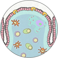 その構造はほかのリンパ節と違ってユニークなもので、小腸の粘膜固有層(こゆうそう)の場合は、上皮(じょうひ)細胞のあいだにM細胞がところどころに並んでいます。M細胞は抗原(こうげん)〈細菌やウイルスなど〉を直接に粘膜内に誘導(ゆうどう)して、免疫細胞たちに渡(わた)し、処理するはたらきをしています。発見者のスイス人医師パイエルにちなんで、この組織はパイエル板と名付けられました。