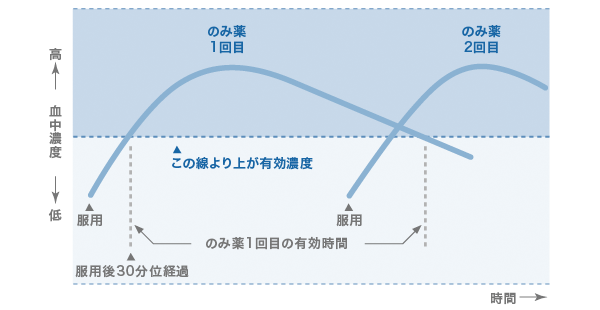 ※こちらの図は一例です。すべての薬がこの図のとおり血中濃度の変化をたどるわけではありません。また、有効濃度に達するまでの時間も薬によって異なります。