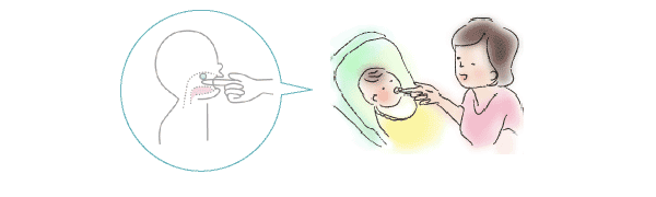 ほ乳瓶の乳首の中に入れて吸わせるか、小さなスプーンやスポイトで舌の上にのせ、飲ませましょう。