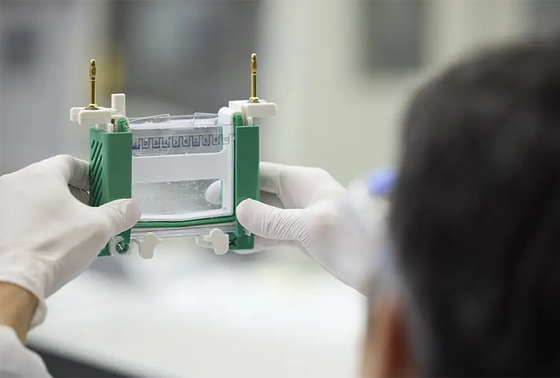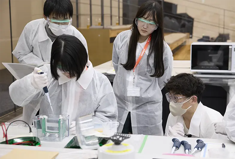 中外LSP横浜内で2023年より運用しているバイオラボ。このバイオラボの取り組みの一つとして展開する高校生向けのバイオ人財育成プログラムは、実験体験にとどまらず、創薬プロセスを深く学べることが特徴です。研究員としてプログラムの企画に協力する丹波の専門は、iPS細胞から作製したオルガノイドを用いた高次細胞モデルの構築と創薬研究への応用です。「実験は、サイエンスの仮説を立てて実施し、結果を解釈して考察するための手段です。このプログラムでは、私たち研究員が大切にする実験の背景にある原理の理解や考察の時間をしっかり確保し、科学的思考のプロセスを学べるよう意識して設計しました。現在は“タンパク質のアミノ酸を改変するための遺伝子操作を学ぶ”と“アミノ酸を改変したタンパク質を精製する過程を学ぶ”という2つのテーマで、高校生向けにプログラムを実施しています(丹波)」。