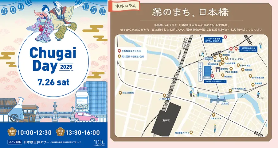 2025年3月10日に創業100周年を迎えた中外製薬。この記念すべき節目を祝い、社員の家族・パートナーに日頃の感謝を伝え、会社の歴史や仕事内容を知ってもらうイベント『Chugai Day』を事業所毎に開催しています。このイベントは単なる社内行事ではなく、革新的な医薬品を通じて患者さんに貢献する中外製薬の使命と、それを支える人々のストーリーを共有する場となっています。7月26日(土)に約2,200名の社員と家族が参加した日本橋本社のChugai Dayを中心に、当社の企業文化が息づくイベントの様子と、事務局リーダーである齋藤、水田へのインタビューを紹介します。