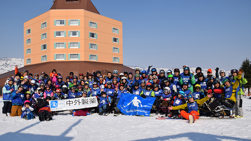 3月2日~3日に日本チェアスキー協会が主催する「中外製薬2019親子で楽しむチェアスキー教室」に特別協賛しました。今年で4年目となるこの活動では、足の不自由な子どもたちが雪上でのチェアスキーを体験し、家族と共に楽しみながらスポーツをする機会を提供しています。前日から社員のガイドボランティアは現地に入り、日本チェアスキー協会、障がい者スキースクール・ネージュからの指導を受け、子どもたちの受け入れに備えました。