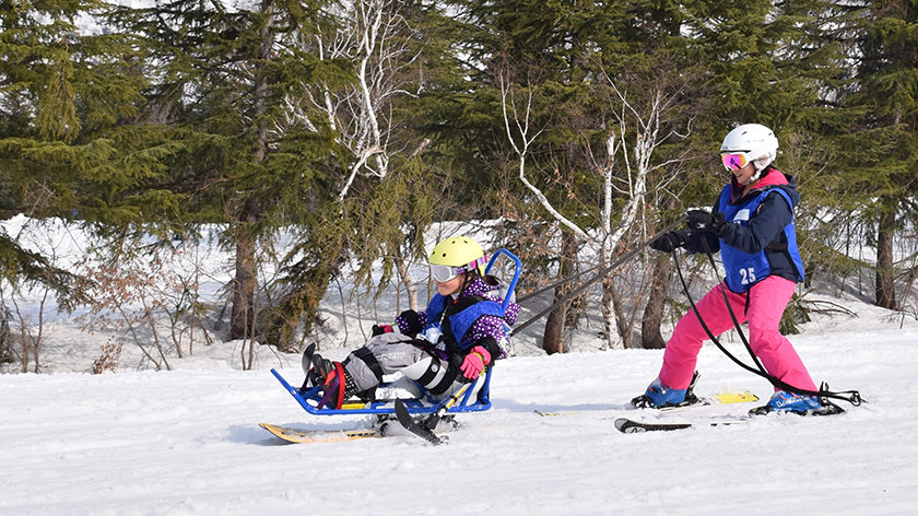 ところが彼女には、健常者である双子のお姉ちゃんと一緒に滑りたいという目標があり、少ない握力でアウトリガーの操作を工夫し、二言目には「一人で滑る」と言いながら、疲れも見せずに頑張り続け、2日目にはロープガイドで見事なスピードで滑走するまでの上達を見せてくれました。また、洋楽やドラマ、小説が好きなことから、脚本家であればなれるかもと、キラキラした笑顔で夢を語る姿もあり、初対面で「できるはずがない」と思ってしまった自分を恥ずかしく感じるとともに、「やるための工夫」の大切さを、改めて実感しました。(ボランティア社員)