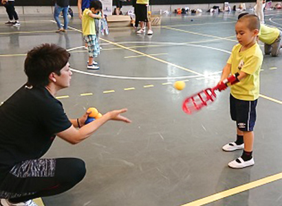 初めはうまくタイミングをつかむことができない子もいましたが、講師から一人一人に合わせたアドバイスを受け、皆がキャッチボールを体験することが出来ました。