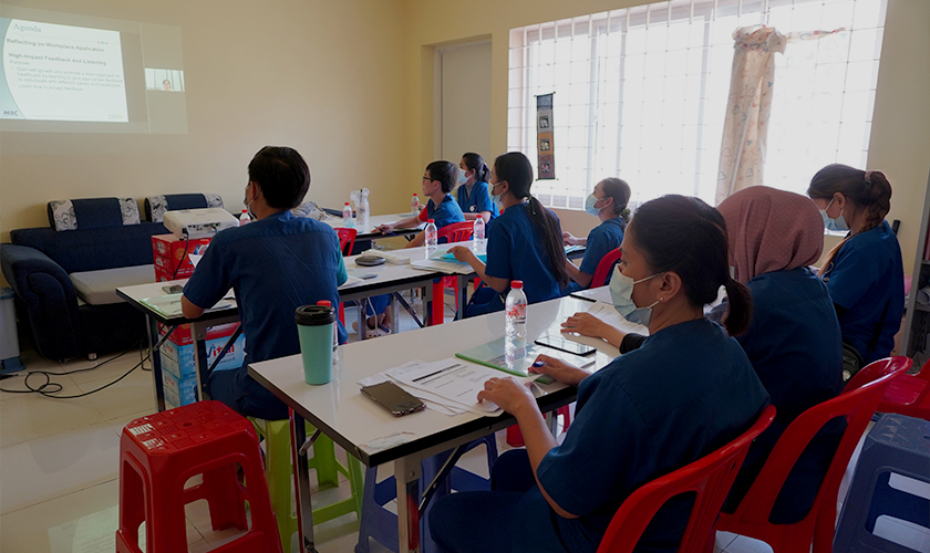 昨年の参加者からのフィードバックを踏まえ、今回は「効果的なフィードバックと傾聴」をテーマとしたセミナーを実施しました。2日にわたる日程のうち、初日は現地で働く日本人医療関係者を対象として日本語で、2日目はクメール人医療関係者を対象にクメール語の通訳を介して開催し、合わせて17名が参加しました。参加者からは、内容も実践的で大変有意義な研修だったとの感想をいただきました。