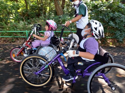 当日は総勢22名が参加し、小学校低学年の子でも無理がないように休憩を取りながら、公園内をハンドバイクで走行しました。慣れてくると、片道5キロ程度の道のりにも挑戦する子ども達も現れ、目標値まで一生懸命に頑張る姿が見られました。