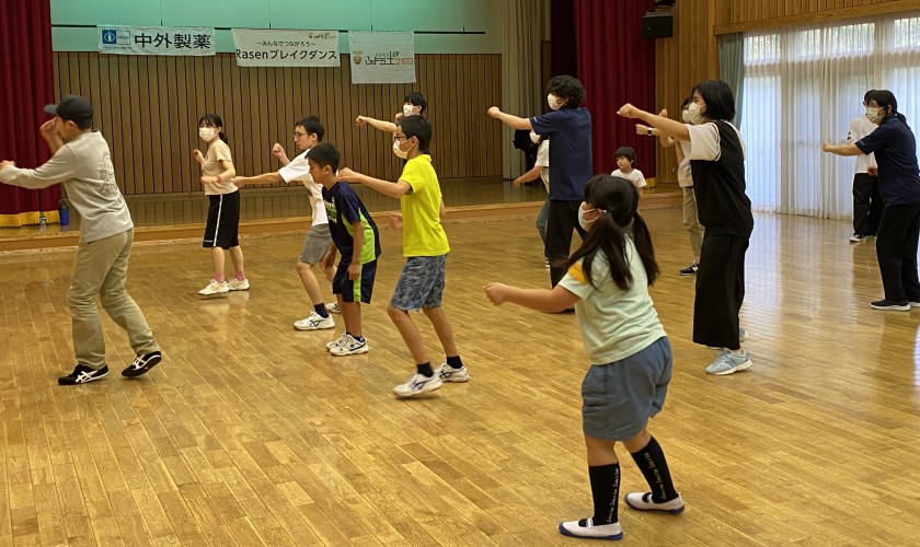今回は、昨年に引き続き2回目の支援で、前回大好評だったブレイクダンス教室を、郡山市の「ミューカルがくと館」で開催しました。プロダンサーであるRASENさんの演技を間近で見た子どもたちは大興奮。手足や体全体を一生懸命に動かしながら練習し、成果発表会では、一人ひとりが精いっぱい踊っていました。