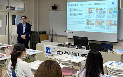 また、「医療統計に関する授業」では、当社YouTubeチャンネルで公開中の動画「宇宙怪人しまりす 医療統計を学ぶ」を用いた医療統計に関する出前授業「新しいクスリを世に出すということ」を実施し、正しい情報を入手し理解して活用する能力の重要性について学んでいただきました。なお、本授業は、第1回を2022年に実施した際にご好評をいただき、今回が2回目の実施となりました。