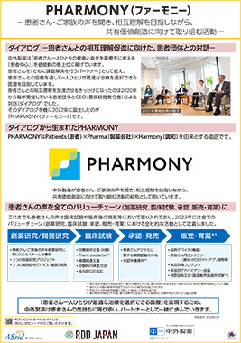 2024年もプラチナスポンサーとして血友病、視神経脊髄炎、脊髄性筋萎縮症の疾患啓発資材や関連するウェブサイトをご紹介しています。RDDパネル展示では、中外製薬が患者さん・ご家族の声を聴き相互理解を目指しながら共有価値創造に向けて取り組む活動、として展開する「PHARMONY(ファーモニー)**」について解説しています。