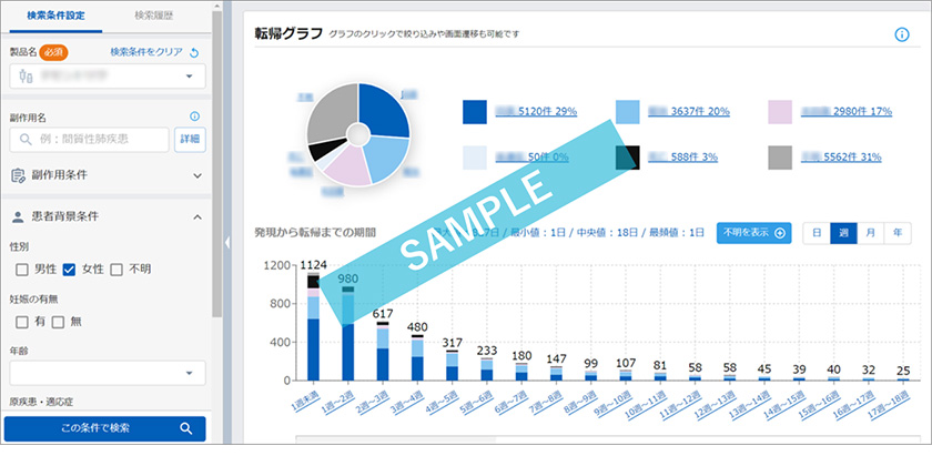 患者さんの年齢・性別・合併症などの条件に応じた、副作用の発現時期、転帰、処置、詳細な経過の確認が可能です。