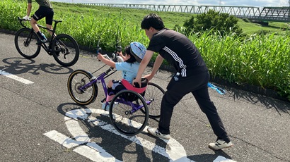 広く抜ける爽快な青空のもと、彩湖の周囲を子どもたちとご家族が一生懸命走り抜けました。ハンドバイクの楽しさを体感することはもちろん、1周約5kmの道のりや途中の険しい坂道を親子で一緒に頑張って乗り越えることで、家族や友達との絆をより一層深めました。