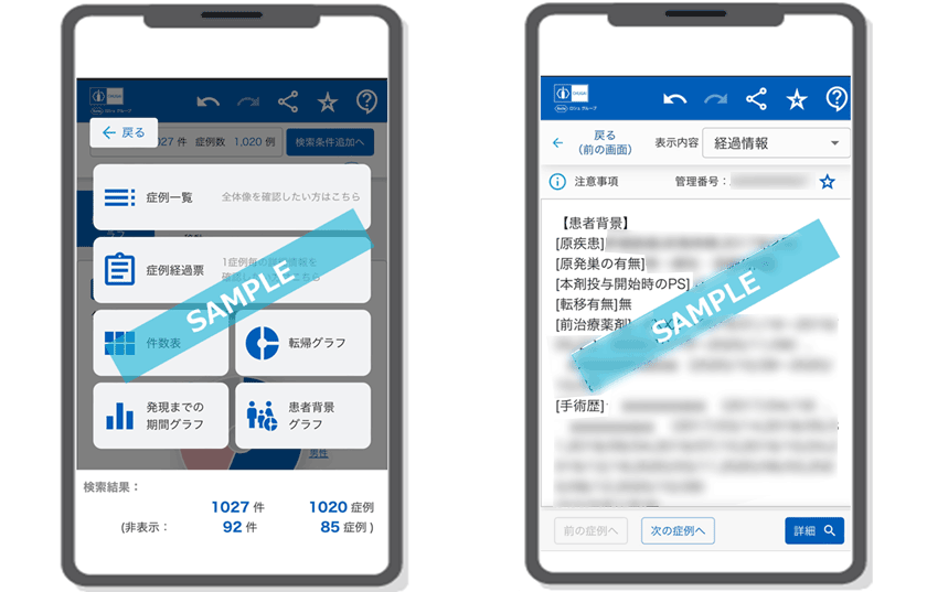 スマートフォンの画面上で、患者さんの年齢・性別・合併症などの条件に応じた、副作用の発現時期、転帰、処置、詳細な経過等の確認が可能です。