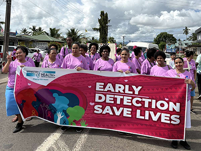 2025年10月22日、フィジー保健省は、UNFPA大洋州サブ地域事務所の支援を受け、ランバサにて効果的な啓発プログラムを開催しました。「早期発見は命を救う」をテーマにしたこのイベントは、ナバラ中学校のバンド、フィジー警察、そして様々な地域関係者が率いる活気あふれる行進で幕を開けました。このキャンペーンは、子宮頸がんとメンタルヘルスに関する専門家の講演を中心に、約1,200人を対象に実施されました。
