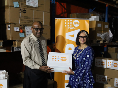 (左:ラトゥ・アトニオ・ラビチ・ララバラヴフィジー保健大臣, 右:UNFPA大洋州サブ地域事務所所長ビディシャ・ピライ)