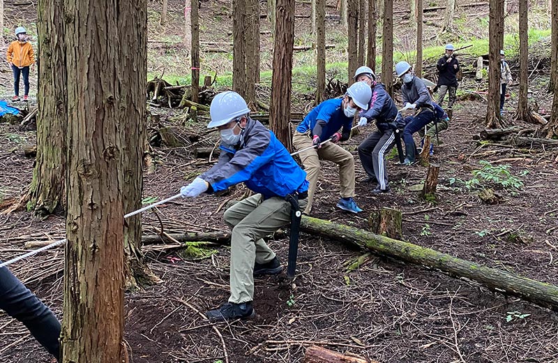 - *6 間伐作業:森が茂りすぎるのを防ぐために、一部の木を伐採し適正な密度の健全な森林に導く作業です。間伐することで、それぞれの樹木へ日光を届けることができ、さらに低木の育成も促すことができるため、健全な森林に導くことができます。