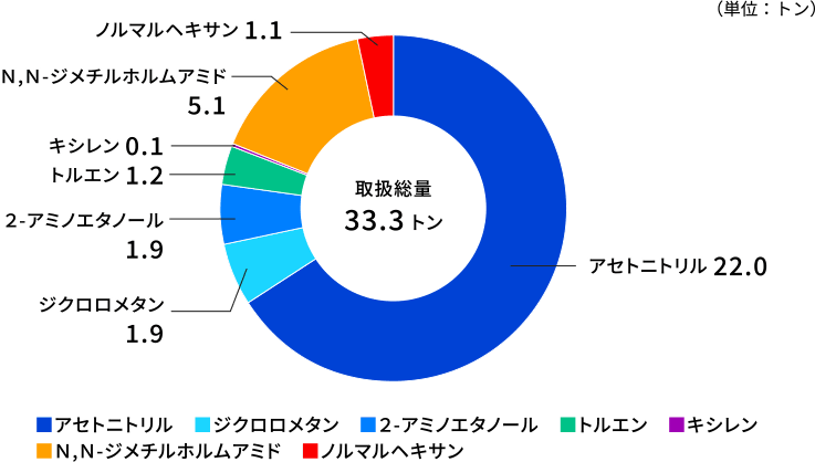 PRTR法*1対象物質の取扱総量は、33.3トンでした。製造時に使用されるSVHC対象のN,N-ジメチルホルムアミドについて、SVHC対象外の代替薬品を新たに採用することでN,N-ジメチルホルムアミドの使用量が大幅に減少しました。