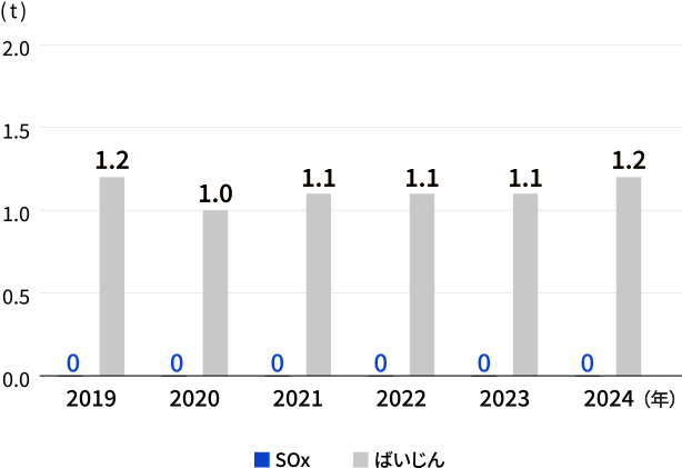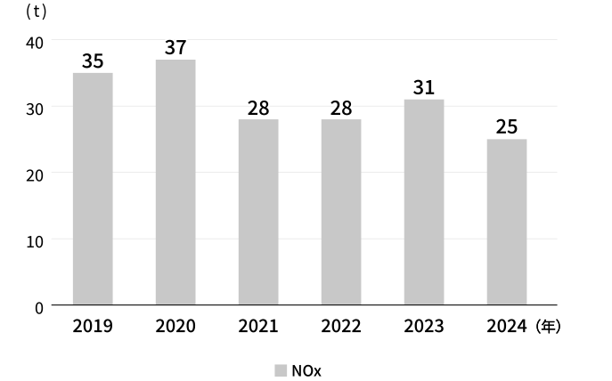 2024年のNOx排出量は2023年差6トン減の25トンでした。コジェネレーションシステムをNOx低排出型に更新するなど、大気汚染防止に努めています。