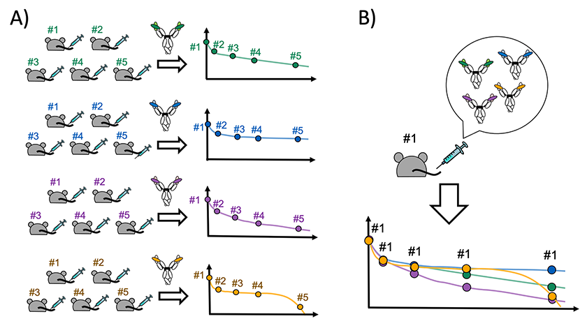 (A) For single-dosing PK of each mAbs using one sample per animal, 60 mice are required to evaluate four mAbs at n=3/group and six time sampling points. (B) For cassette-dosing, the PK of a mixture of four mAbs by microsampling, four mice are required to evaluate four mAbs at n=3/group and six time sampling points.