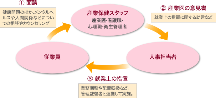 病気やケガによる不調者や休業者だけでなく、健康診断の有所見者、長時間労働者、妊産婦、障がい者など、就業について健康状態への配慮が必要なすべての従業員に対して、産業医、看護職、心理職、衛生管理者などの産業保健スタッフと、人事担当者および職場の管理監督者が下図のように連携して、必要な支援を行っています。