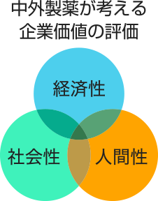 - *「経済性」「社会性」「人間性」とは、それぞれ「利益成長を図り永続的な発展を果たすこと」「製薬企業として社会からの要求に応え続けること」「社員が働きがいを持って能力を高め続けられる環境をつくること」であり、これらを高い次元で調和させることが企業価値の向上と持続的な発展につながると考え、従来より中外製薬が追求している3つの要素です。